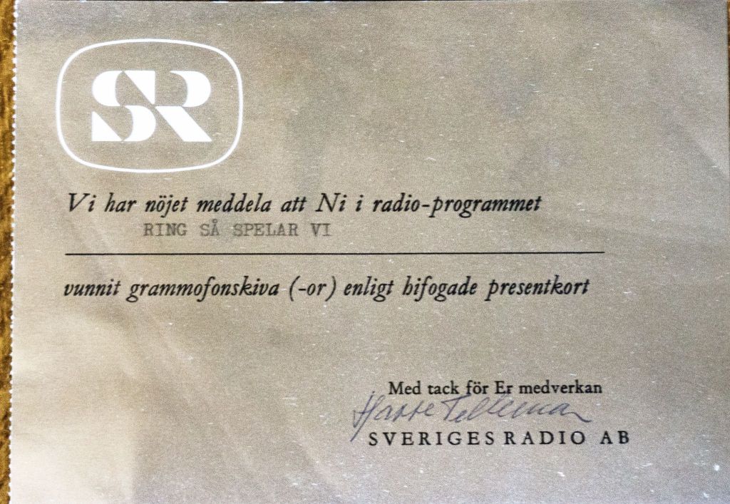 Jag har en gång varit med i ”Ring så spelar vi”. Slutsiffran 84 och landskapet Halland. Jag ringde och kom alltså med. Det var ren tur alltsammans och ingen skicklighet, bara att lyfta på luren. Hasse Tellmar var väldigt trevlig att tala med. Vi pratade 10,5 minuter, jo jag tog tiden. Svaret på frågan var Dinariska Alperna. Ett namn som jag hade stött på för kanske något år sedan, men som nu kom till nytta. Av detta kan vi lära oss: Det är bra att ha tur och oviktig kunskap kan komma till hjälp när man minst anar det. För presentkortet köpte jag en LP-skiva med jazzmusikern Ove Lind.
