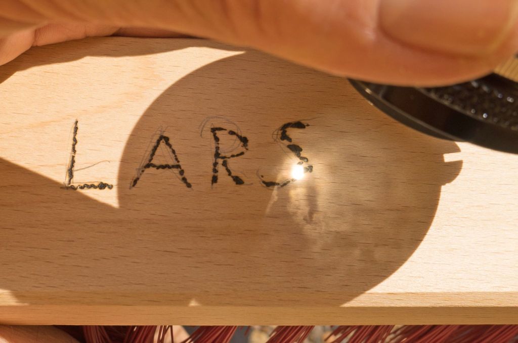 Utan solen skulle mörker och tystnad råda. Vi kan alla enas om att solen är alltings yttersta drivkraft som ger ljus och liv. Den är så stark så tittar vi rakt in i den så blir vi blinda. På våren gillar jag att använda solen till att bränna in mitt namn. Jag tycker det är fantastiskt att jag kan förminska hela solen som är alltings livgivare till en liten prick. I det här fallet på en piasavakvast. Jag som gillar gamla kameraobjektiv bränner gärna med ett sådant för då ser jag molnen runt solen tydligare. Här använder jag ett objektiv från början på 60-talet.