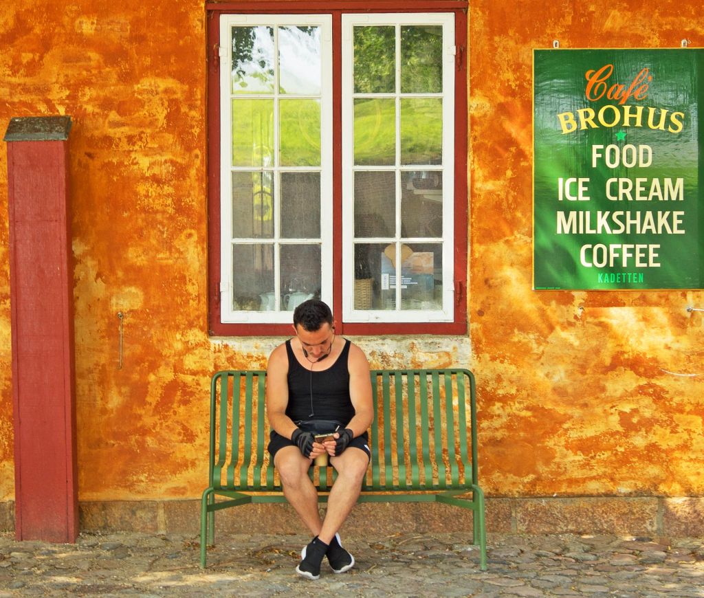 Den här mannen sitter försjunken i sin mobiltelefon. Jag tog bilden igår, 20 juli, i Helsingör. Jag vet inget om honom vilket gör att jag funderar på vad han får för meddelande på sin mobil. Kanske får han ett glatt besked att han äntligen blir hembjuden till sin käraste som han länge önskat. Eller så får han veta att hans käraste gjort slut och aldrig vill se honom mer. Han spelar kanske på hästar och har nu fått ett 100% stalltips som kommer att göra honom stenrik. Sjukhuset har kanske meddelat att han är sjuk, eller att han nu är botad från sin sjukdom. Jag tänker att det är kanske mycket som rör sig i huvudet på honom som jag aldrig får reda på. Låt oss vidga tanken; vad vet vi egentligen om de okända personer som vi ser och möter varje dag? Vi vet ingenting! Jag tänker på några rader av Gunnar Ekelöf: ”En värld är varje människa”.