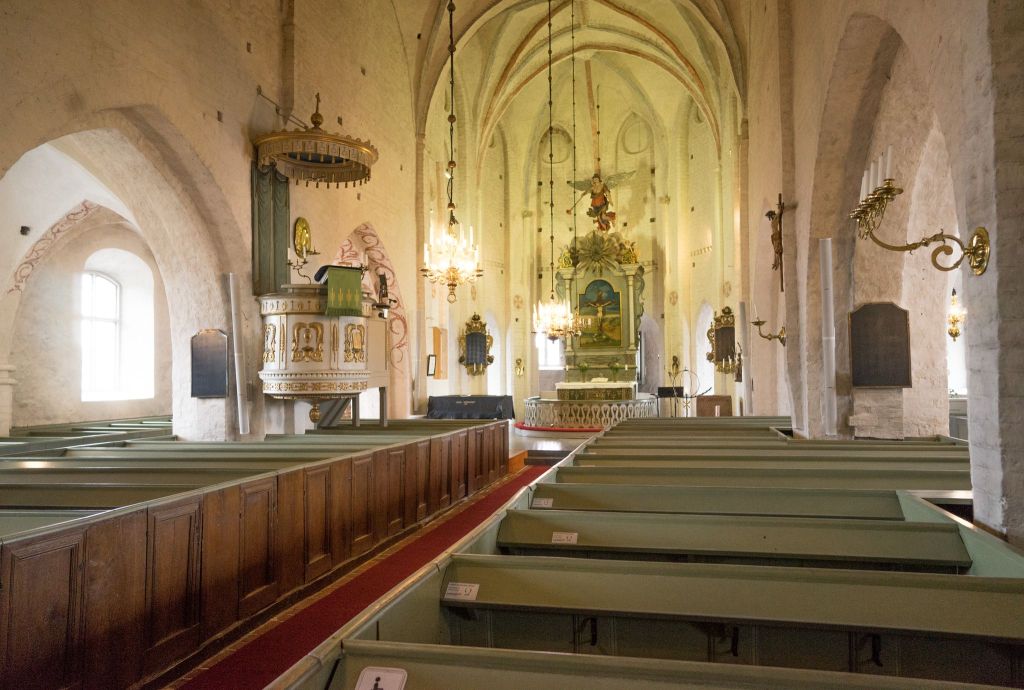Här ser ni en bild från St Maria kyrka i Båstad. För väldigt många år sedan var jag med mamma och pappa på en weekendsemester i Båstad. På lördagskvällen gick vi till en aftongudstjänst här. Jag trodde och hoppades att den skulle bli kort. Men där bedrog jag mig! Prästen predikade och jag tyckte det var så ointressant. Hans mässande och tråkiga röst var så jobbig att höra och inte begrep jag vad han talade om. Jag intalade mig själv att det gjorde knappast någon i kyrkan. Så knuffar mamma lätt på mig, pekar på en dam med en jättestor hatt och viskar: ”Den tanten, hon känner Greta Garbo”. Jag vet inte hur mamma visste det, men jag tror hon hade fått det från någon damtidning. Så resten av gudstjänsten såg jag för mitt inre hur Greta Garbo elegant rörde sig i de himmelskt glittrande kretsarna bland Hollywoods filmstjärnor där hon var den största av dem alla. Säkert var damen i hatten med på några av dessa partyn och nu satt hon bara några meter framför mig! Detta minns jag med glädje men av prästens ord minns jag inget.