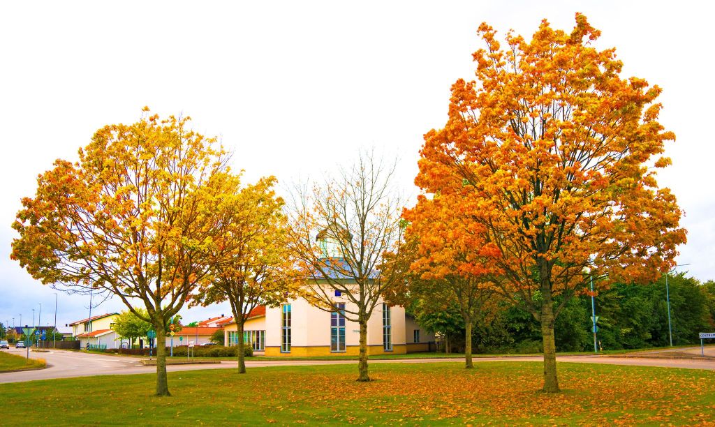 Nu kan vi konstatera att sommaren är över, för den här gången. Det kan nog kännas ledsamt när kvällarna blir mörkare och temperaturen sjunker. Men jag tycker att naturen tröstar oss med att göra löven vackert gula, röda och många nyanser däremellan. Då blir saknaden av sommaren mildare. Stig Dagerman skrev att människans behov av tröst är omättligt. Förmodligen har han rätt. I bakgrunden ser ni Sollyckans Kyrka. Den får vara en symbol för den tröst som religionen ger. Utöver detta så finns andra sätt att söka sin tröst såsom t ex i musik, poesi, konst och mycket mera. Men vi får inte glömma att man kan njuta mycket av naturen, religionen och allt det andra utan att vara ledsen, men som ett gott sätt att höja sin livskänsla.