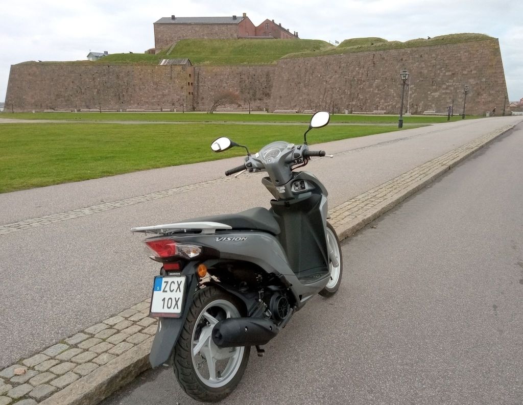 Här har jag parkerat min scooter framför Varbergs Fästning. Jag kör ganska ofta med den. Det blir relativt korta turer på den halländska landsbygden. Ibland tänker jag att jag skulle kunna köra långt med den. Utan problem kan jag hålla 70km/tim, för det är en behaglig hastighet. En tanke som slår mig ibland är att på en dag skulle jag kunna köra till gränsen mellan Danmark och Tyskland. Nästa dag kunde jag fortsätt in i Tyskland och efter ytterligare två dagar skulle jag vara i Schweiz som jag borde kunde köra igenom på två dagar. Efter några dagar till är jag framme i Rom. Detta är fullt möjligt och jag fantiserar om att göra det. Men jag vet att det blir inte av, fast bara det faktum att möjligheten finns är värd en del. En gammal kinesisk tänkare sa: ”Igår kväll innan jag somnade tänkte jag tusen tankar, men på morgonen och dagen som följde gjorde jag som vanligt”. Tänk så många möjligheter det finns och så få av dem som vi kanske tar till vara. Martin Luther visste det och kallade det ”Förspillda tillfällen.” Men vem vet; Kanske får ni i framtiden se min scooter parkerad framför Colosseum.