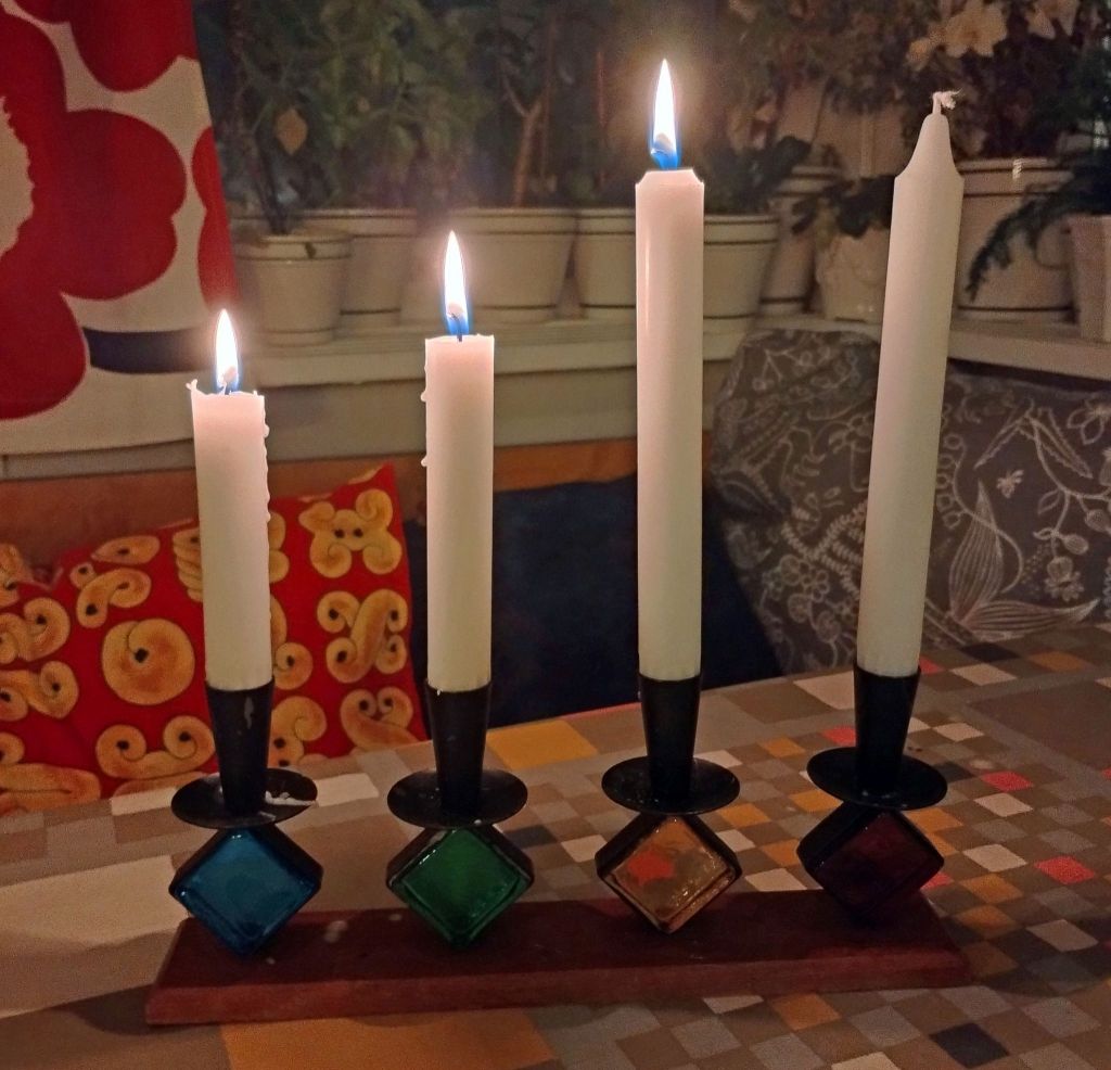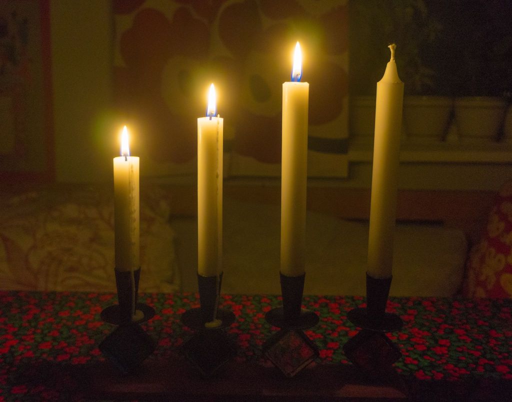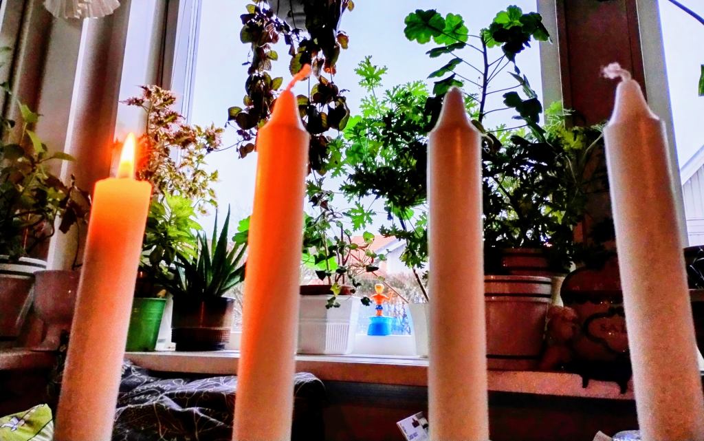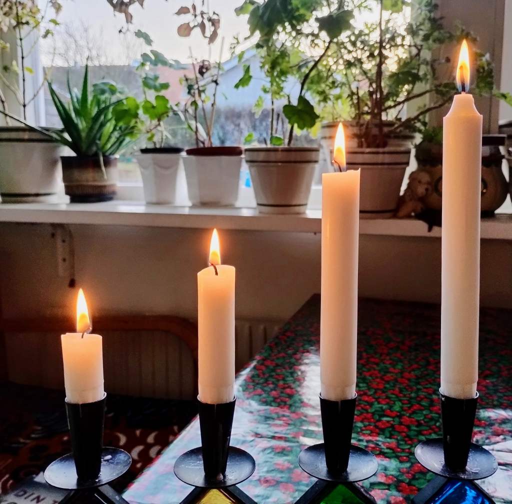 Nu är det fjärde adventsljuset tänt. När vi tänker på fyra finns det en hel del stoff. Här kommer några exempel: Spelar vi kort är det bra att ha fyrtal i ess, då har vi så klart trumf på hand. Just nu är det vinter som är den fjärde årstiden. Jag tror att det är personligt vilken av de fyra vi tycker bäst om. Men jag tror att de flesta gillar gränsen mellan den första och andra årstiden, alltså försommaren. Vi uttrycker vårt gillande inför personer och händelser med ett fyrfaldigt leve. (I Skåne nöjer de sig med trefaldigt leve. Det sägs att de menar att det fjärde levet är avsett för kungen men eftersom Skåne vill vara självständigt markerar de detta med att nöja sig med tre). I Bibeln finns det fyra evangelier, Matteus, Markus, Lukas och Johannes som var ett på sitt sätt beskriver Jesus. Lukas evangeliet 2:1-20 handlar om Jesu födelse och blir uppläst under julhelgen. Texten i den svenska schlagern från filmen ”Den stora Kärleken” (1938) handlar om ett rike där Amor sitter på tronen och man sjunger ”Det är den stora, stora,stora, stora kärleken”. Gösta Stevens, som skrev texten, sa att kärleken, som är det viktigaste i livet, måste upprepas fyra gånger och inte tre som är det vanliga. Det finns en underbar inspelning av Ulla Billqvist när hon sjunger den sången. -Finns på Youtube.