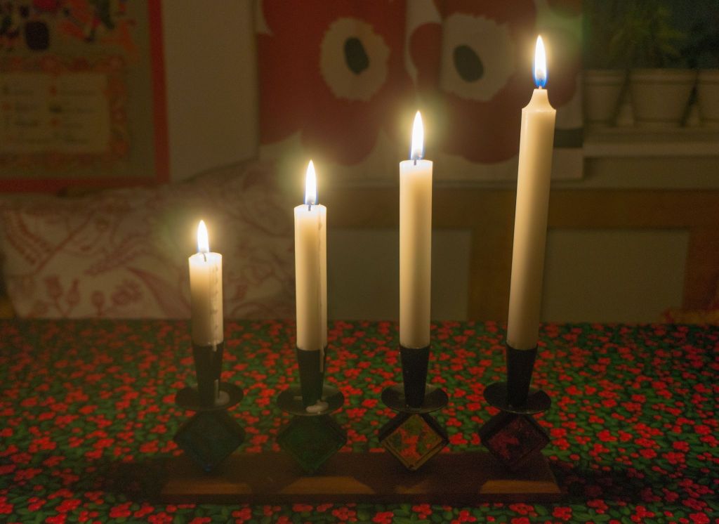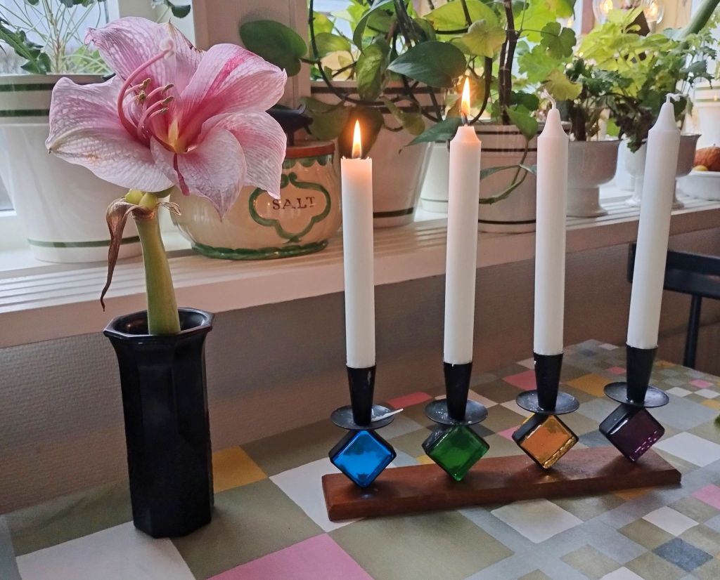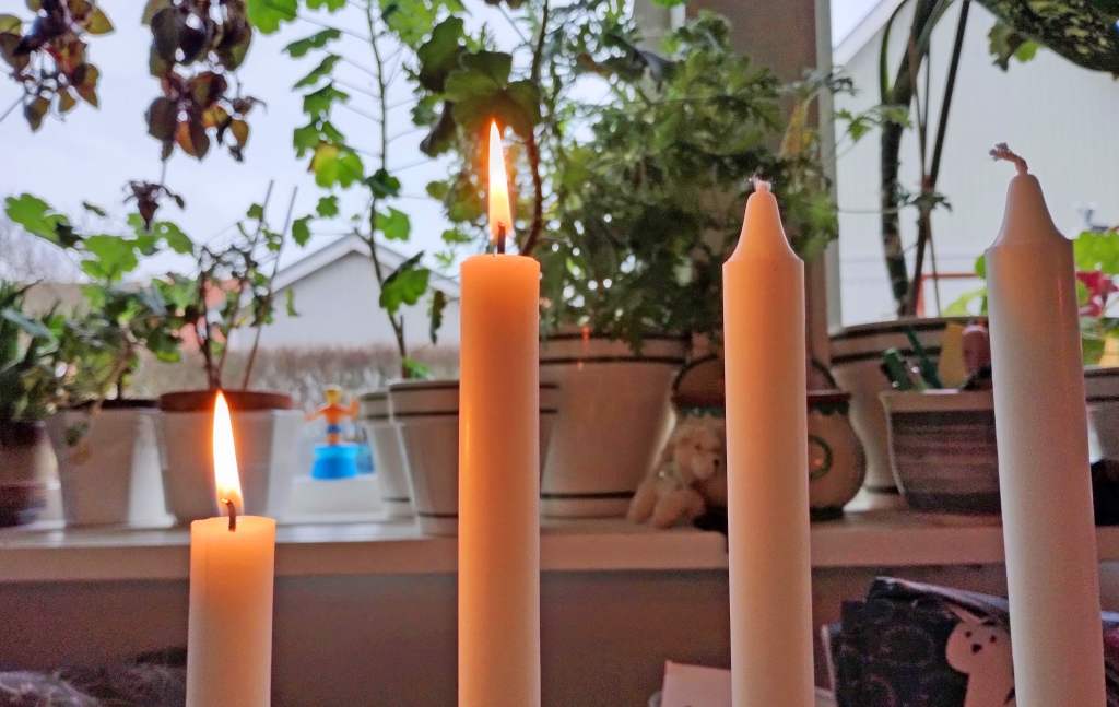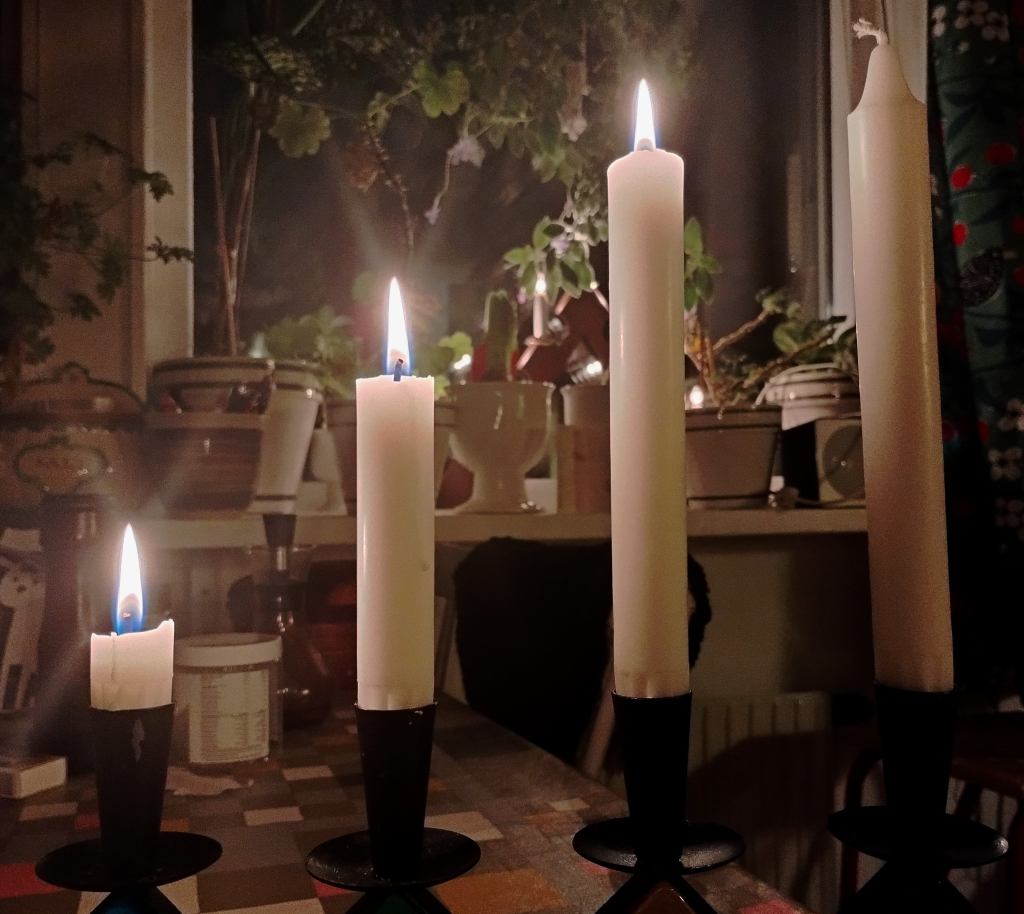Nu är det fjärde adventsljuset tänt. När vi tänker på fyra finns det en hel del stoff. Här kommer några exempel: Spelar vi kort är det bra att ha fyrtal i ess, då har vi så klart trumf på hand. Just nu är det vinter som är den fjärde årstiden. Jag tror att det är personligt vilken av de fyra vi tycker bäst om. Men jag tror att de flesta gillar gränsen mellan den första och andra årstiden, alltså försommaren. Vi uttrycker vårt gillande inför personer och händelser med ett fyrfaldigt leve. (I Skåne nöjer de sig med trefaldigt leve. Det sägs att de menar att det fjärde levet är avsett för kungen men eftersom Skåne vill vara självständigt markerar de detta med att nöja sig med tre). I Bibeln finns det fyra evangelier, Matteus, Markus, Lukas och Johannes som var ett på sitt sätt beskriver Jesus. Lukas evangeliet 2:1-20 handlar om Jesu födelse och blir uppläst under julhelgen. Texten i den svenska schlagern från filmen ”Den stora Kärleken” (1938) handlar om ett rike där Amor sitter på tronen och man sjunger ”Det är den stora, stora,stora, stora kärleken”. Gösta Stevens, som skrev texten, sa att kärleken, som är det viktigaste i livet, måste upprepas fyra gånger och inte tre som är det vanliga. Det finns en underbar inspelning av Ulla Billqvist när hon sjunger den sången. -Finns på Youtube.