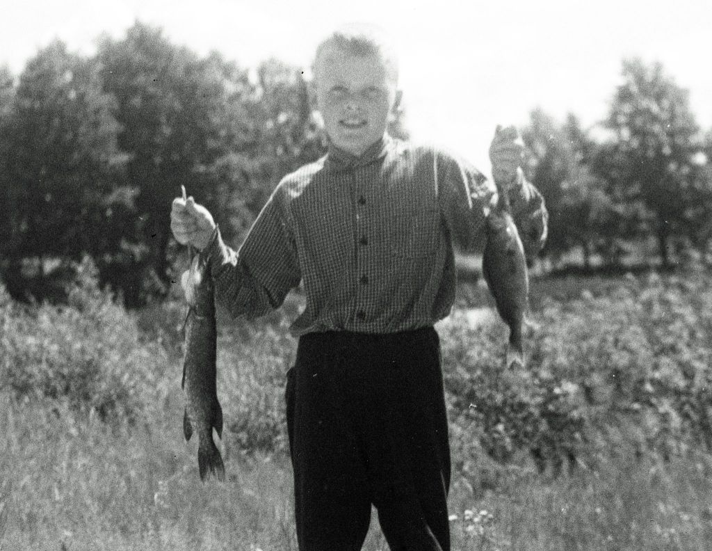 Denna bild tog pappa på mig när vi kommit iland från en fisketur. Jag hade dagen innan köpt en haspelrulle för 13:- Jag var så ivrig att inviga den. Min mamma, farmor och faster stod på land och tittade. Jag skrek att nu använde jag rullen för första gången och jag kommer att få en gädda. Tänk, jag fick direkt en gädda på första kastet. Ni ser den i min högra hand. Jag kände så klart på mig att jag skulle få napp. Var det för att det var förutbestämt? Är händelser som är av betydelse för oss förutbestämda? Härom råder det så klart oenighet bland många tänkare. Kyrkofadern Augustinus menade att det är förutbestämt vilka som kommer till himmeln och vilka som kommer till stället där det inte finns änglakörer eller harpospel. Detta oavsett hur man lever sitt liv. En intressant tanke. För min del fick jag ju en liten smak av himmelens fröjder då jag drog upp gäddan! -Ni kan ju fundera över om det var förutbestämt att ni skulle läsa denna tanke.