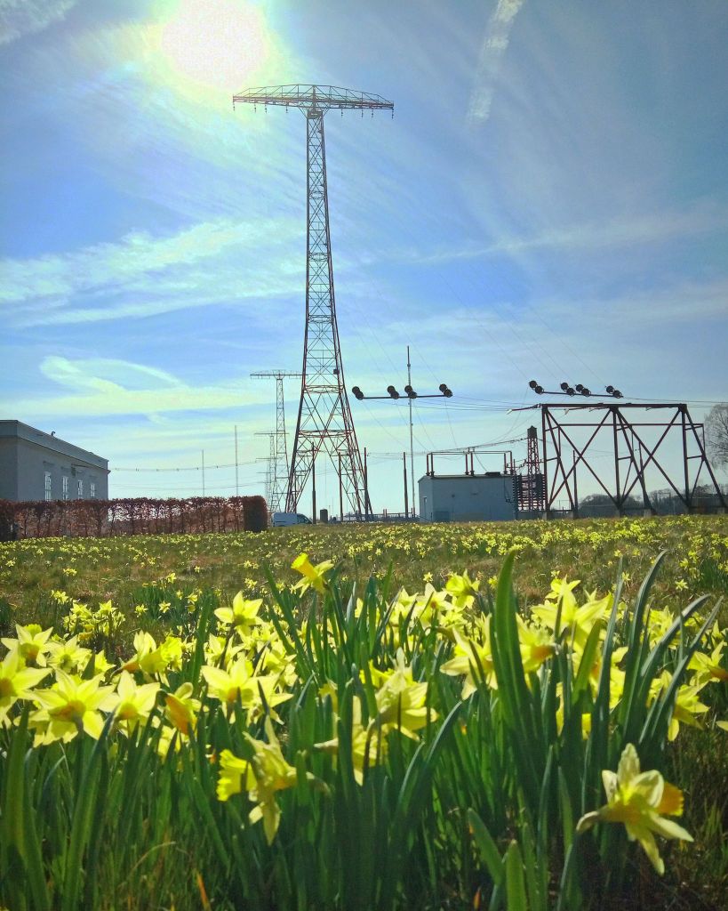 Igår, Annandag Påsk när jag var utanför radiostationen i Grimeton och tog kort på alla påskliljorna tog jag också detta kort. Jag tänkte på begreppet tretal när jag tog bilden. Med tretal är det något speciellt. Ni vet att man säger ”Tro, hopp och kärlek, men störst av allt är kärleken”. I kristendomen är Gud treenig: Fadern, Sonen och Helige Anden. Mitt foto är också ett exempel på tretal. Solen som lyser, de utslagna påskliljorna och radiomasterna. Det går att vidga tanken genom att tänka att först kom solen som väckte liv i naturen och så kom människorna till jorden som den tredje komponenten. Vi bygger märkliga ting, som radiomaster som kan sända budskap över Atlanten. Jag hoppas ni lagt märke till att jag gav er tre exempel som vart och ett innehåller tretal!