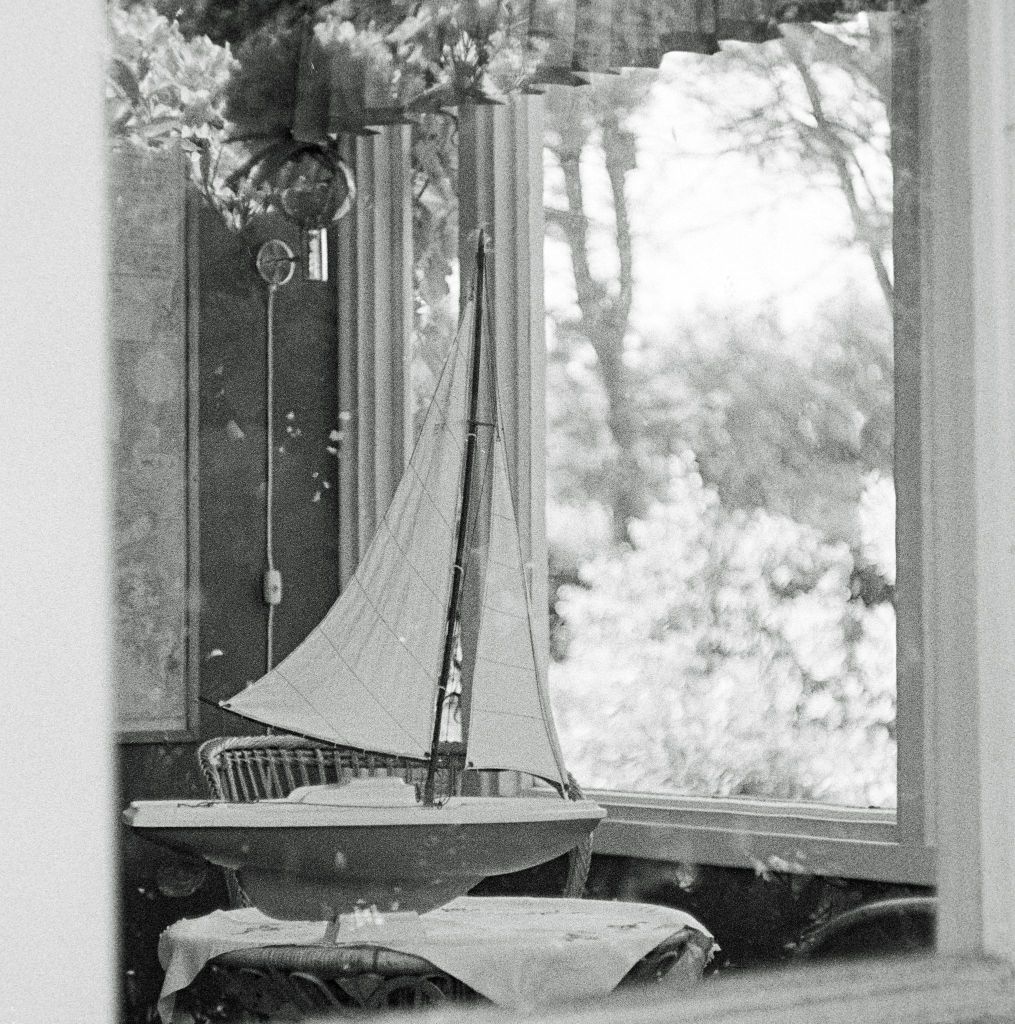 Den här bilden tog jag i smyg för ganska många år sedan då jag gick förbi en sommarstuga. Där var ingen hemma så jag gick in på tomten och tog bilden. Som ni ser är det en modell av en segelbåt som står framför ett fönster. Jag tyckte lite synd om segelbåten som bara får stå där och titta längtande ut. Jag tänkte på Gustaf Fröding som i en av sina dikter skriver att han känner sig som en man som sitter bakom galler och ser hur livet pågår utanför. Segelbåtar ska vara ute bland vågorna och vindarna. De är avsedda för det. Människor ska deltaga i livet. De är avsedda för det.
