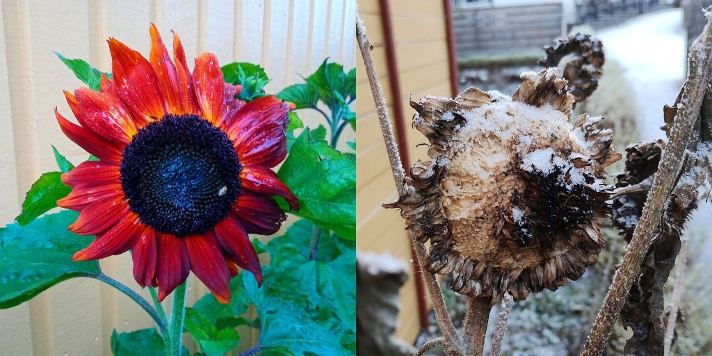 En av de många solrosorna har mer eller mindre givit upp och slokar nu på sin stjälk. Fåglarna pickar i sig frön, så in i det sista bjuder solrosen på glädje. När fröna är slut har slutet kommit för den förr så vackra röda solrosen. Så är det för i stort sett allting; Det finns ett slut som väntar. Eller är det så? Solrosen kommer att leva vidare genom de frön som jag tar, sätter till våren och så blir det en ny solros. Så arten solros kommer att leva vidare trots att denna solros från sommaren 2024 kommer att försvinna. Människor dör. När ingen längre minns dem är de borta för alltid. Nya människor föds så arten människa kommer nog att bestå så länge världen existerar. Jorden, som är så blå och vacker sedd från rymden, kommer också att försvinna när den bränns sönder av solen en gång i tiden. Kommer det en ny jord då så att arten jord kommer att bestå? Jag brukar tänka på en hinduisk uppfattning. -När jorden är borta vidtar en s.k. Brahma Natt. Den är väldigt lång. Så här lång är den: Man tar ett extremt tunt silkestyg och vart 100.000 år berör man mycket varsamt toppen på världens högsta berg. När berget är nednött så är Brahma Natten över. Då kommer en ny jord med nya människor, solrosor och fåglar att uppstå!