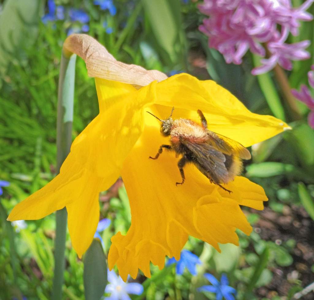 Biet har hittat en maskros som det mer eller mindre har borrat sig ner i. Enda anledningen är att samla nektar för att ta med hem till bikupan och sörja för bisamhällets överlevnad. Det är i stort sett vad biets liv går ut på. Biet stannar nog aldrig upp och funderar vad dess liv går ut och om det har någon djupare mening. Vi får senare njuta av biets arbete när vi äter god och söt honung. Vi har det inte så lätt som biet. Vi stannar nog upp då och då för att fundera över livets mening. Jag tror att det är mycket olika från människa till människa. Men vissa av oss borrar nog ner sig som biet. Fast inte i maskrosor. Jag tänker på alla nördar som finns och som nästan glömmer omgivningen för sitt djupa intresse av en speciell natur. Jag har hört talas om shacknördar vars liv går ut på att fördjupa sig i spelets oändliga möjligheter och som ser sin omgivning som shack pjäser som det gäller att hålla koll på och bjuda motstånd för att inte förlora. Det finns skivnördar som kan allt om artister och vilka bolag artisterna spelat in sina skivor på, hur omslagen ser ut och vilka som gjort dem. De vet vilken typ av vinyl som skivorna är gjorda av och vilka som återger ljudet bäst. Det finns fågelnördar som vet jättemycket om fåglar och är beredda att när som helst på dygnet ge sig av till någon avlägsen plats för att under en kort stund förhoppningsvis få se skymten av just den fågel de längtat efter att få se. Det är bra att det finns nördar för de kan från sina djupa, ibland udda, kunskaper som de borrat ner sig i, svara på frågor som vi kanske tänkt på. Det är bra att bina borrar ner sig i blommor så vi får honung.