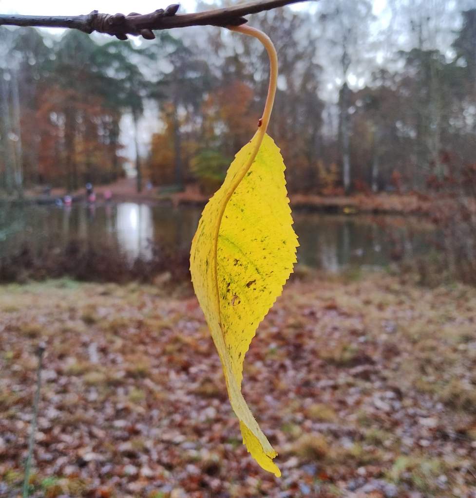 Jag gillar det gamla begreppet Rätta Stunden. Det betyder ungefär att det som händer inträffar precis i det ögonblick då allt stämmer. Det är, såvitt jag uppfattar det, inget vi kan styra eller bestämma över. Lövet hänger löst på sin gren och är ensamt efter det alla dess lövkompisar redan fallit till marken. Det bestämmer inte själv när det ska falla men när tiden är inne släpper det från grenen. Jag tror att om vi tänker efter så har många händelser i våra liv inträffat just i den rätta stunden. Vi har inte kunnat planera dem eller förutse dem, de har bara kommit till oss. I framtiden väntar säkert mycket av olika slag som vi nu inte vet något om. Men var säkra på att de kommer att inträffa i den rätta stunden. (Bilden tog jag i Brunnsbergsskogen intill Svarta Havet)