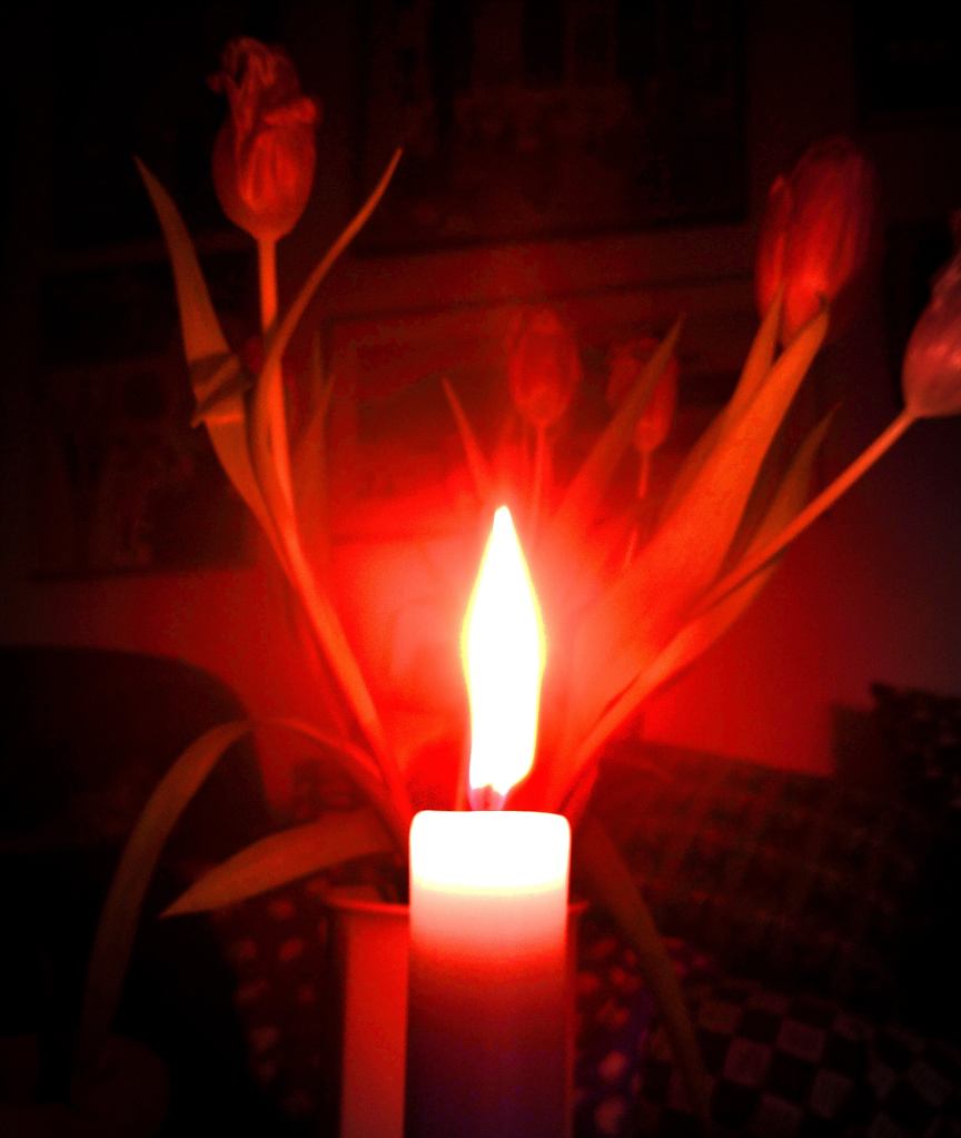 Det sägs då och då att vi lever i en kall värld. Krig som pågår, känslan av meningslöshet, inte känna sig behövd m.m. När jag idag såg tulpanen i trädgården tyckte jag den såg ut som eld; gul och röd. De gröna bladen var frostnupna, ni ser ju froststrimmorna. Efter ett tag kom solen med sin värme, tulpanen slog ut och frosten försvann. Tänk om det funnes en sådan sol som smälter bort krig, meningslöshet och ensamhet. Vet någon var den finns, så tag fram den och låt den skina starkt!