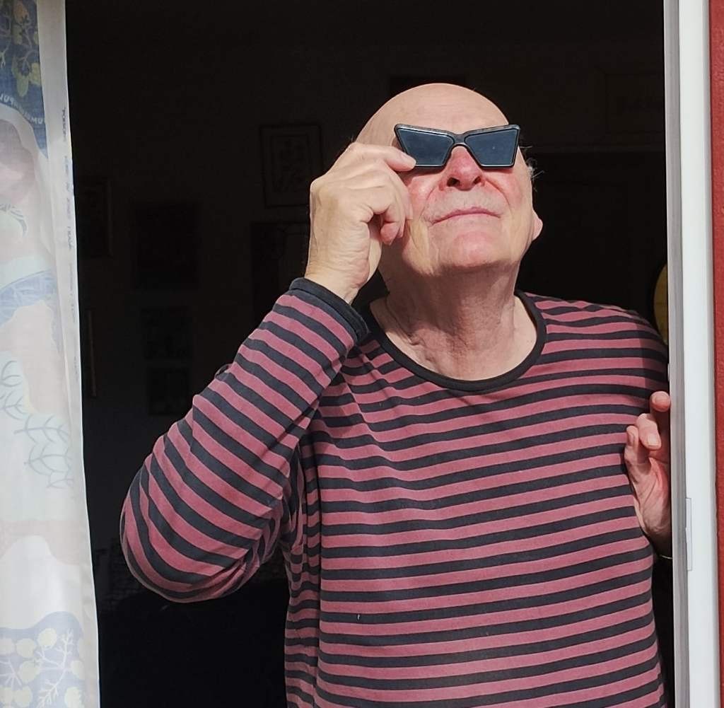 I lördags, 29 mars, var det partiell solförmörkelse. Jag såg den genom glasögonen som är från den 30 juni år 1954 då det var total solförmörkelse i Sverige. Genom dessa glasögon såg jag i lördags hur solen sakta skymdes av månen och jag kände att det blev en aning kallare och lite mörkare. Att titta på solen utan dessa glasögon vore förödande för ögonen och sannolikheten att man får skador eller rent av blir blind är stor. Jag tänker att titta på solen genom dessa glasögon kan liknas vid att betrakta verkligheten. Är man religiös ser man verkligheten genom sina glasögon och ser att gud eller hans motsats finns lite överallt. Är man kapitalist ser man genom sina glasögon var pengarna finns så att man kan berika sig ordentligt. Är man konstnär eller författare så ser man genom sina glasögon var motiv finns som är värda att avbilda eller händelser som kan passa i en berättelse. En fråga som filosofer funderat över är om det är möjligt att se den verkliga verkligheten utan något som helst skydd. Kanske verkligheten är så obegriplig så måste vi använda skyddsglasögon för att begripa en aning och kanske få inspiration.