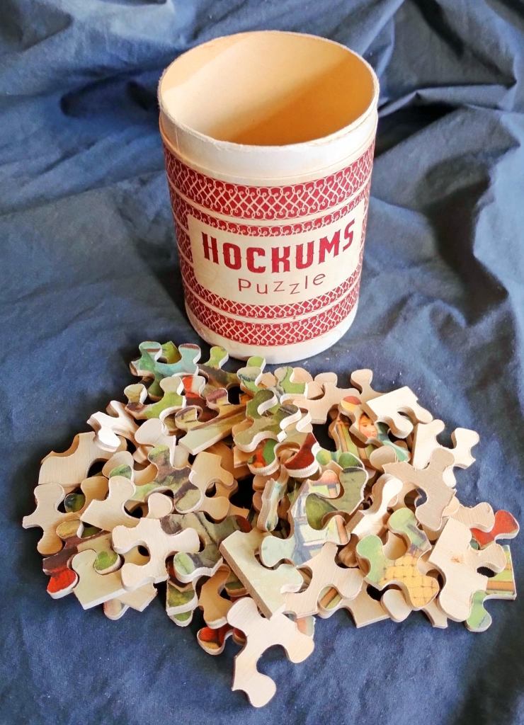 Den här burken fick jag av min farmor. Den innehåller ett pussel där bitarna är utsågade i riktigt trä. Numera består väl många pussel av tjock kartong. På framsidan finns en bild så man vet vad man ska lägga för något. Det finns det inte på mitt pussel så jag har ingen aning om vad det ska bli för bild när jag väl lagt det. Men ännu efter många år har jag inte gjort det så det börjar väl bli dags. Jag tänker att det finns något filosofiskt i detta med pussel. De som har en bild på framsidan talar ju om vad det ska bli när det är lagt. Det är som ett liv där man på något vis bär en bild inom sig om vad som förväntas att man ska göra med sitt liv. Bitarna kan liknas vid de förväntningar som omgivningen, religionen, uppfostran m.m. ställer och det gäller att uppfylla dessa för att det ska bli rätt när alla förväntningarna är uppfyllda. I mitt pussel utan bild finns ingen förväntan på vad det ska bli. Det är som ett liv där man inte bryr sig om förväntningar utan det får bli som det blir. Det ger en frihet och när pusslet är lagt så kanske det blev en jättefin bild. Två livsmöjligheter utifrån pusseltankar: Att försöka uppfylla andras krav eller att gå sin egen väg. Båda leder till varsin bild varav den ena är förutbestämd och sannolikt tråkig medan den andra är överraskande och rolig.