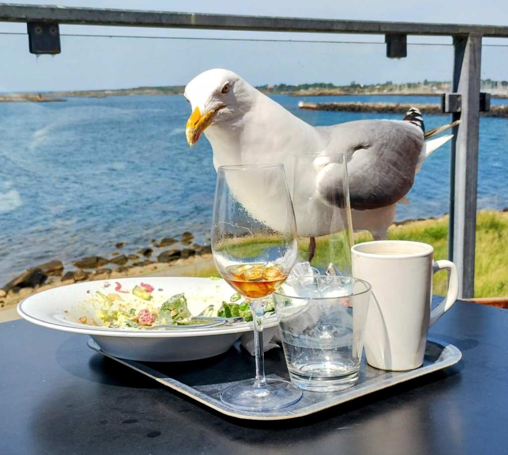 En havstrut satt och väntade på att någon skulle lämna bordet så den snabbt kunde få sig ett ordentligt mål mat. Den missade inte tillfället! Jag tror att det är viktigt att ta vara på de tillfällen som ges i livet. Många av oss tänker nog på en mängd missade tillfällen som har funnits alldeles framför oss men vi missade dem eller så brydde vi oss inte om dem. Att dessa tillfällen inte återkommer är svårt att acceptera. Jag tänker också på uttrycket ”Att äta eller ätas”. Om inte vi tar för oss av det som livet ger så tar någon annan det rakt framför näsan på oss. -Havstruten var först och snodde andra fåglar på godsakerna.