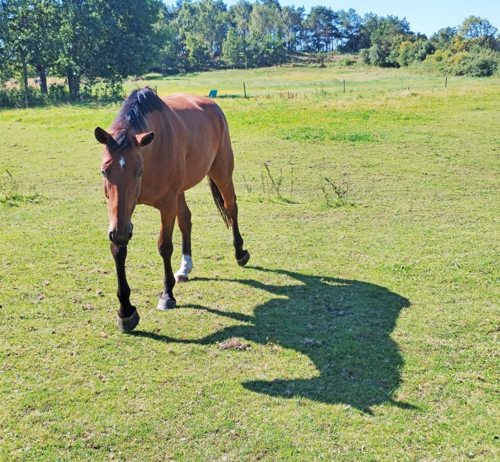 På bilden ser ni en häst som njuter av sommaren. Jag tycker det ser ut som om den har en fin stund när solen skiner och det finns mat på marken. Dess skugga följer med den hela tiden. Tänk er nu att vi tar bort själva hästen och så ser vi bara skuggan. Kan ni då av bara den dra slutsatsen att skuggan kommer från en häst. Det kan ni säkert för skuggan är en ”bild” av hästen. Skulle vi hålla upp en räfsa så ser vi dess skugga eller varför inte en cykel. Vi behöver alltså inte se de verkliga tingen det räcker med skuggorna för att vi ska förstå vad det är. Detta är en ytterst förenklad bild av Platons idévärld. Han menar att allt vi ser och omger oss av här i världen bara är skuggor av de verkliga tingen som finns i idévärlden. Så själva hästen, räfsan och cykeln vars skuggor vi ser är bara skuggor från idévärlden. Det betyder att vi ser skuggor av skuggorna. I idévärlden finns de fulländade sakerna. För vår del alltså den fulländade hästen, räfsan och cykeln. Tyvärr får vi människor inte se de fulländade tingen bara deras skuggor. Jag vet att det är krångligt men ni kan ju pröva att tänka på att allt ni ser bara är skuggor som är bilder från idévärlden.