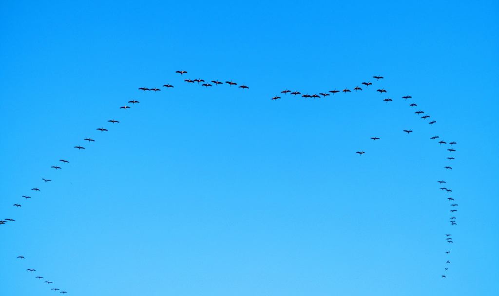 För ett tag sedan kunde vi både se och höra flyttfåglar flyga fram i skyn. De flög rakt över huset, så tydligen har de en farled häröver som de följer. Jag frågar mig ofta; Vart är de på väg? När kommer de tillbaka? Längst fram flyger en fågel. Det blir bäst så för lyftdynamiken gör att de bakomvarande inte behöver anstränga sig så mycket. De behöver nog inte tänka, bara följa med. Dessa fågelstreck kan vara en liknelse för mänskligt beteende på ont och gott. Många väljer att följa en ledare och följa det som hen säger. Man tycker det blir bäst så och man behöver ju inte anstränga sig, bara följa flocken. I en diktatur har man inget val. Ledaren måste följas. Att säga emot kan medföra svåra straff. Därför vågar man inte göra annat än det som man blir tillsagd. I sitt inre vet de flesta att det är en fel väg och det kommer att ”gå åt skogen”. Detta gäller på många områden även om det inte är så hårt som i en diktatur. På en del arbetsplatser känner de anställda att de är bäst att göra som chefen säger om man vill ha kvar sitt jobb och inkomst. I religioner, speciellt inom sekter, finns en ledare som vet vad gud vill och då måste församlingen lyda och är nöjd med det och säger halleluja lite då och då för att visa sin samhörighet med de andra. Men säger man emot kan djävulen komma och straffa den som sagt emot ledaren. Jag beundrar de som har gott uppsåt och vågar säga emot. Dessa djärva människor måste finnas. Tyvärr ser det ut som om de blir allt färre. Men tiderna kan ju ändras. Att flyttfåglarna kommer tillbaka kan vi tolka som att det blir fler som säger ifrån och gör tillvaron bättre!