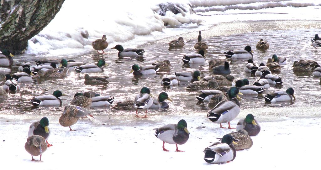 Jag går ofta till den lilla dammen Svarta Havet. Änderna där ägnar dagen åt att umgås och vänta på att några ska komma och mata dem. De behöver aldrig vänta länge för det kommer barn, vuxna och pensionär i en strid ström med plastpåsar fulla med mat. Nu i vinter har vattnet då och då frusit, De allra flesta änderna håller sig i öppningen som inte fryser till så länge fåglarna är i rörelse. Ibland ser jag änder som gått ut på den snötäckta isen för att ligga där en liten stund för att vila sig eller komma ifrån de andra. Det har, vad jag vet, aldrig hänt att någon and har frusit fast i isen. De är kloka nog att inse att inte stanna för länge i stillastående vatten. Jag tänker ganska ofta att änderna är en symbol för tänkade och ideologier som hela tiden måste vara i rörelse för att inte frysa till och stelna i gamla tankesätt. De måste röras om för att utvecklas.Änderna som sitter på isen kläcker nog nya idéer som de för med sig så det blir nya impulser som utvecklar tänkadet. Jag tror vi kan enas om att det är viktigt att vi lyssnar till andra kulturer och låter dem påverka och utveckla vårt tänkade Det är så vi får den viktiga dynamiken i ideologierna. Tänk gärna på det nästa gång ni matar änder.