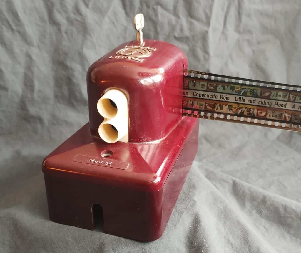 Här är svaret på vad filmremsorna används till. De tillhör en leksaksprojektor Dux Kino. Man drar upp fjäderverket, sätter i en remsa, tänder belysningen i de två objektiven, startar projektorn och då matas filmen långsamt in. Filmen har två fält, ett övre och ett undre som visas växelvis. Då ser det ut som personerna rör sig, fast bara på två sätt, mer eller mindre motsatt varandra. Jag fick projektorn i julklapp när jag var liten och tyckte det var så roligt att personerna rörde sig. Jag fick några filmer till den. Det var bl a Pinoccio, Musse Pigg, och så en färgfilm om Rödluvan. Nu tänker jag att projektorn är en enkel förklaring till filosofen Herakleitos filosofi. Han menade att det som håller allt igång är spelet mellan motsatser. Glädje och sorg, kärlek och hat, ateism och gudstro, värme och kyla, blött och torrt mm. Så hålls världen igång, liksom filmremsan matas in med sina motsatser. Jag ska försöka laga projektor och spela in någon scen så ni får se hur det fungerar. Så nu har ni något att se fram emot!