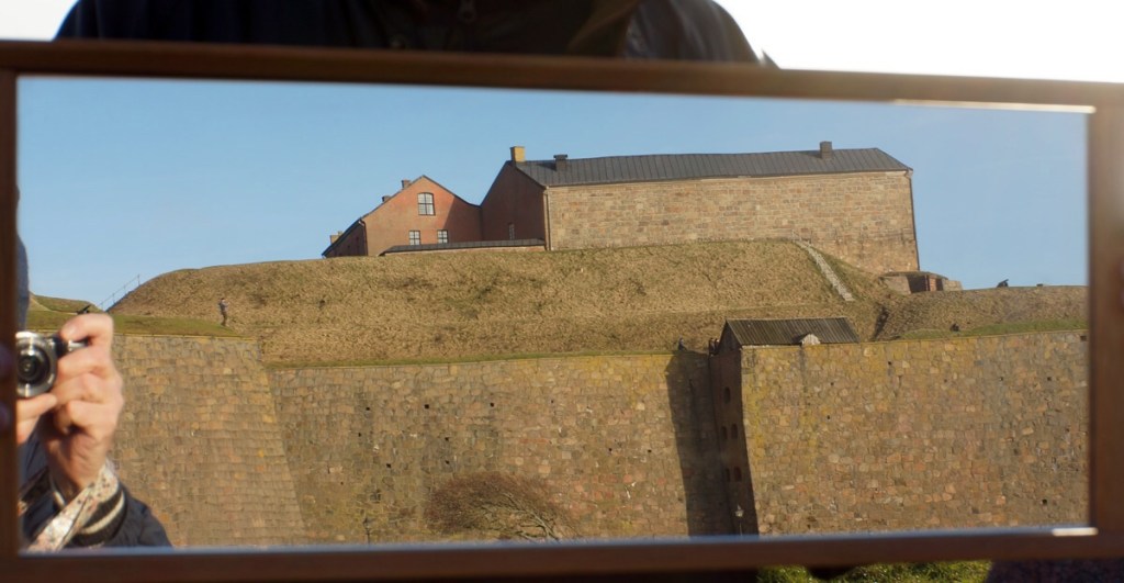 Här är en bild tagen i en spegel. Det är Varbergs Fästning som på bilden av naturliga skäl blir spegelvänd. En vanlig bild på Fästningen är ju en bild och inget annat, bilden är ju inte själva Fästningen. Om man då tar bilden i en spegel så blir det en spegelbild av en bild som bara är en bild och inte Fästningen. Man säger att ögonen är själens spegel. Alla, utom du själv, kan se dina ögon och din själ som speglar sig i dem. Men du kan bara se dina ögon i en spegel. Alltså kan du bara se en spegelbild av en bild av din själ. Du är den ene i världen som inte kan se ditt eget ansikte utom i en spegel eller på ett fotografi. -Så här krångligt blir det om man börjar filosofera över speglar. Håller du två speglar mot varandra så speglar de sig i varandra. Det känns som man ser en spegelbild av oändligheten!