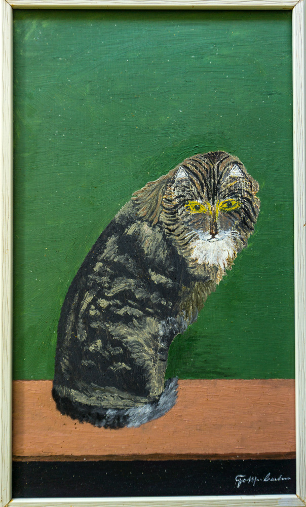Jag tänker på det ibland när katten Arra ligger i mitt knä och spinner. Tavlan ni ser är målad av Gottfrid Carlsson. Han bodde i Vimmerbytrakten och var förtjust i katter. -Katter är psykologer, brukade han säga.