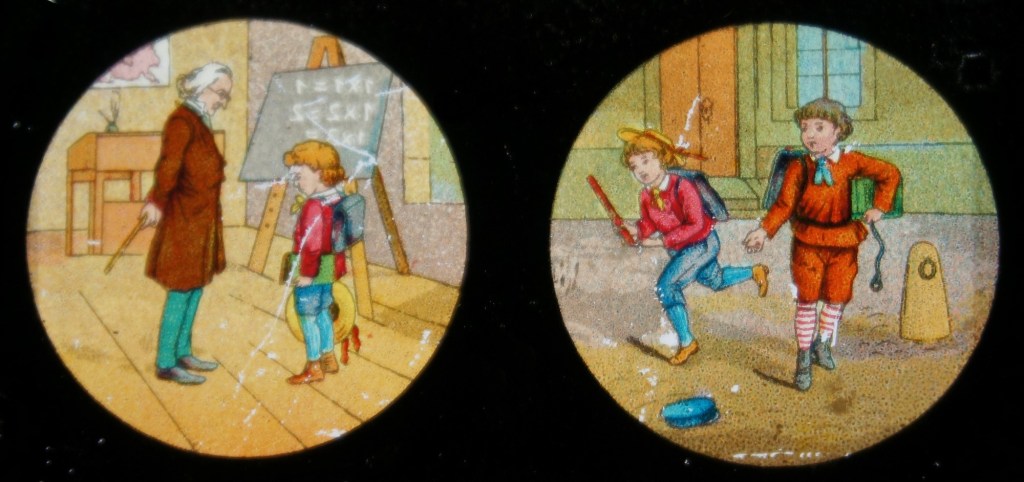 De här två bilderna kommer från en glasskiva med olika motiv. Den var avsedd att sättas i en projektor där ett stearinljus skulle brinna och fungera som lampa och bilderna skulle visas på en vit vägg. Min mamma och hennes bror fick denna leksak av min morfar på 1920-talet. Meningen var att barn skulle hitta på egna historier till bilderna och på så sätt sätta sin fantasi i rörelse. Som ni ser är det en pojke som står framför sin lärare och på den andra bilden barn som leker. På 1970-talet funderade några, jag tror det var pedagoger, på vad som skulle hända om skolan inte fanns. Man menade att barnens tankar och spontanitet kvävs av skolan. Bild två kan ju tolkas som att barn tycker det är roligare att vara ute och leka och slippa skolan. Men det finns säkert fler tolkningar som ni själva kan komma på.